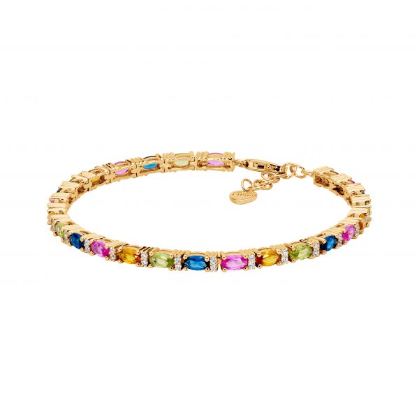 Sterling silver gold plated 18cm bracelet with extension chain, white and multi colour cubic zirconias.