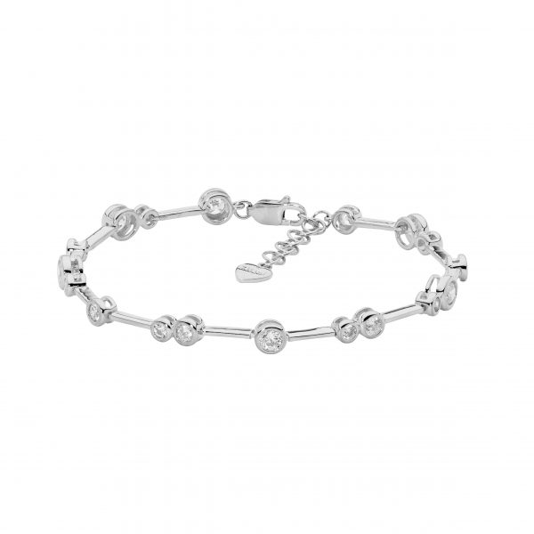 Sterling silver 17.5cm bracelet with extension chain, bezel set white cubic zirconias.