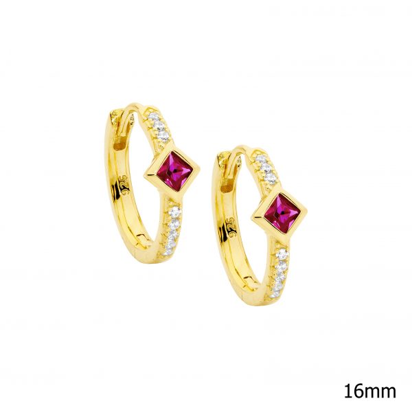 16mm hoop earrings set with red princess cut and white round cubic zirconias.
