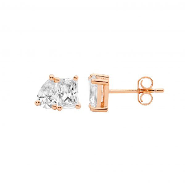 Emerald & pear cut cubic zirconia earrings set in sterling silver with rose gold plating.
