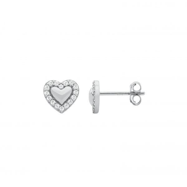 Sterling silver 8mm heart earrings set with cubic zirconias.