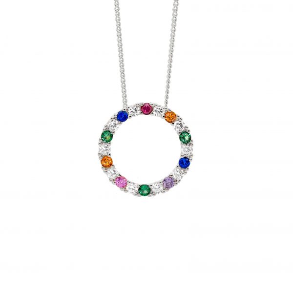 16mm circle pendant with multi colour cubic zirconias, 45cm chain.