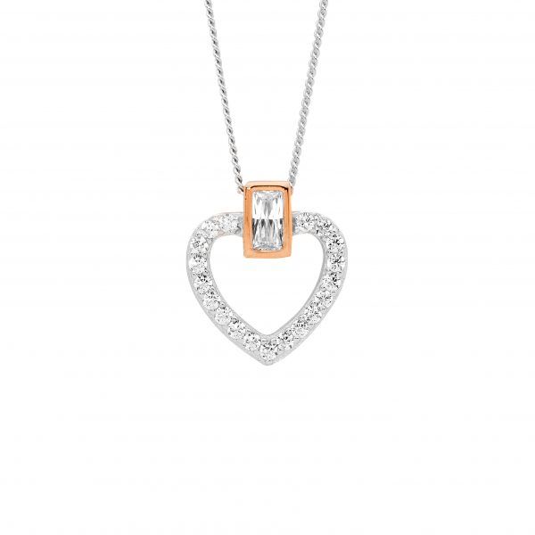 Heart pendant set with baguette and round cut cubic zirconias.