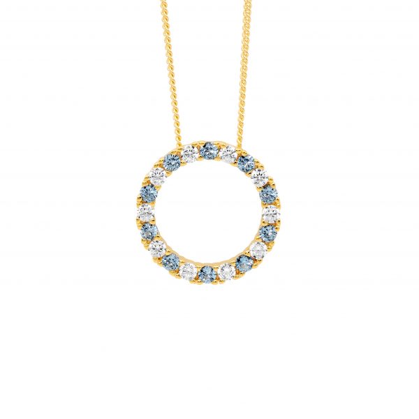 Spinel & white cubic zirconia 16mm circle pendant set in sterling silver and gold plating.