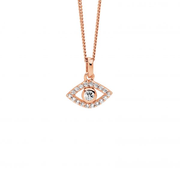 Evil eye pendant set with white cubic zirconias.