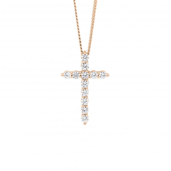 Sterling silver 19mm cross pendant with cubic zirconias and rose gold plating.