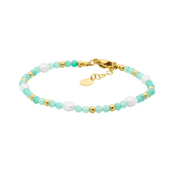 Amazonite beads with freshwater pearls, gold IP plated stainless steel bracelet. 17.5cm with extension.